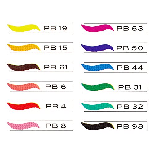 Includes: Canary Yellow: PB19, Yellowed Orange: PB15, Dark Umber: PB61, Carmine Red: PB6, Crimson Red: PB4, Pink: PB8, Mulberry: PB53, Violet: PB50, Ultramarine: PB44, Dark Green: PB31, Parrot Green: PB32 and Black: PB98