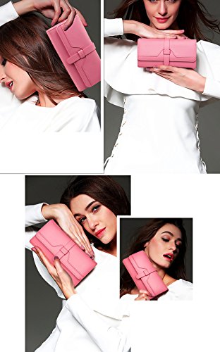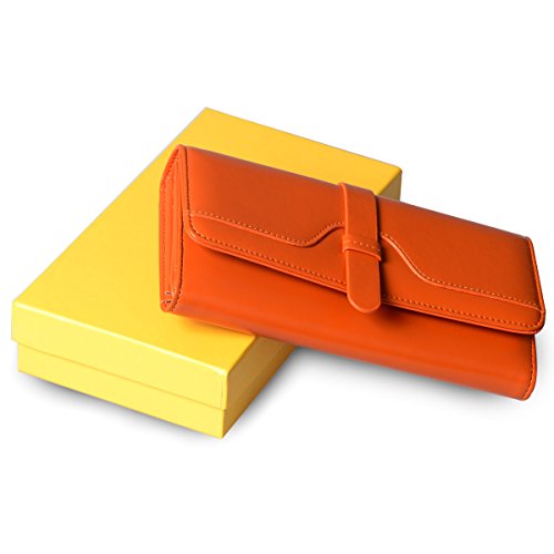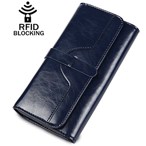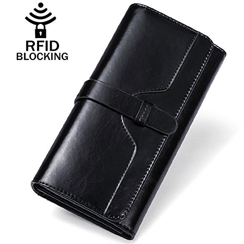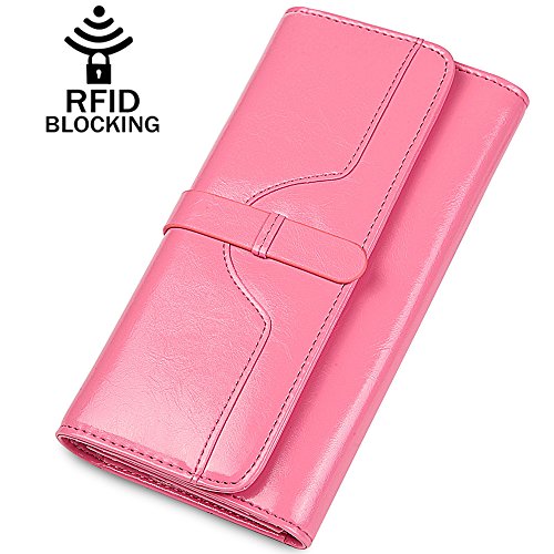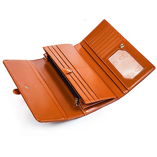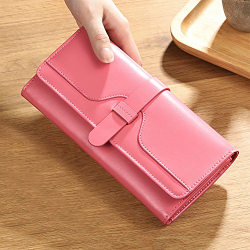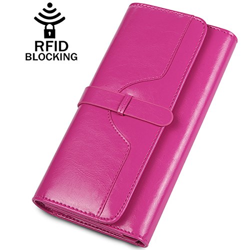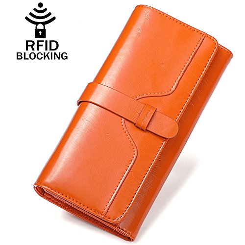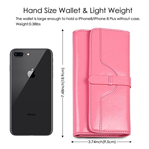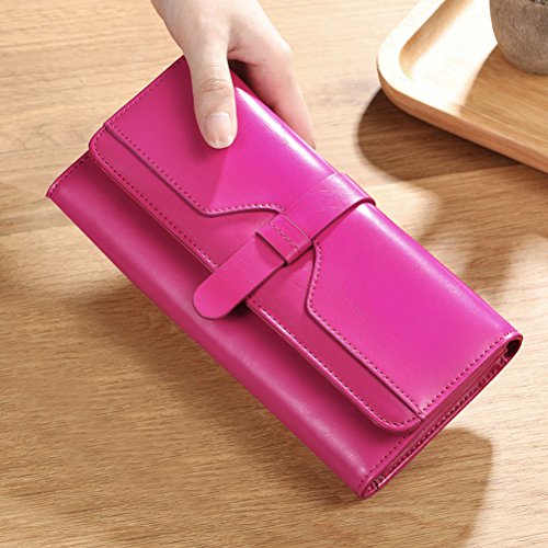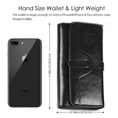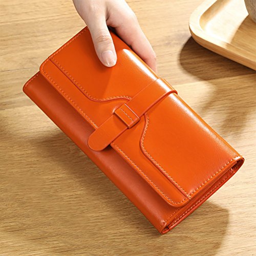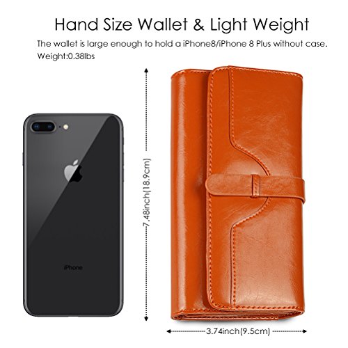 ? High quality genuine waxed cowhide leather / RFID blocking fabrics ? Vintage style, noble and elegant, waterproof ? Snap button closure with buckle ? Large wallet size : 7.4"L x 3.7"W x 1.4"H ? Lightweight Wallet : 0.38lb net weight ? Multicolor choices : Brown/ Black/ Orange/ Pink/ Dark Blue/ Rose Red