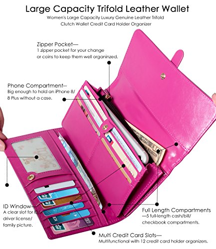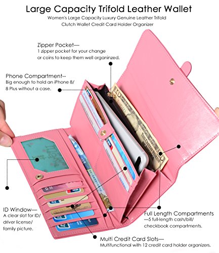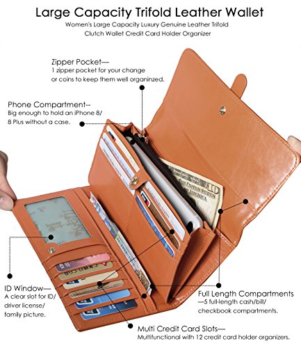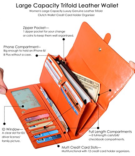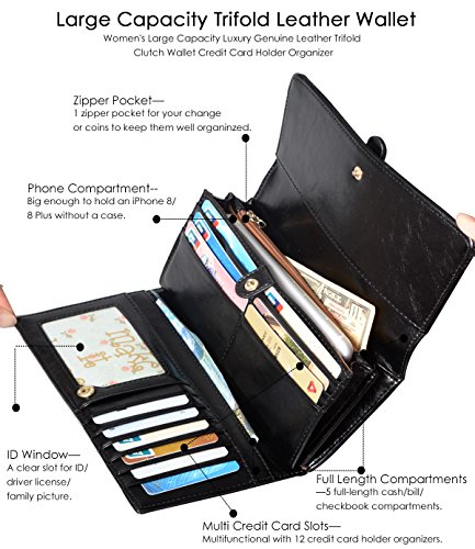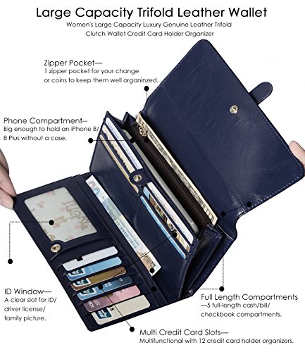 ? Holds All your Essentials Large capacity card holder includes 12 credit card slots, 1 ID window, 5 full-length compartments and a zippered pocket. Keep your credit cards, cash, coins, notes, receipts, checkbook and your phone well organized.