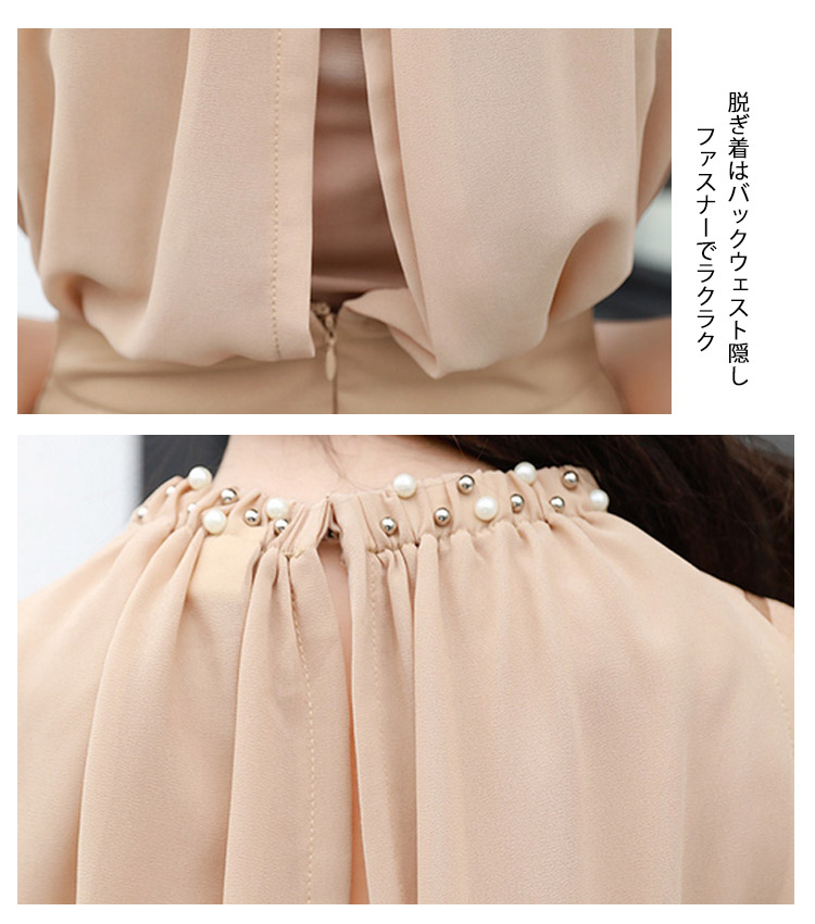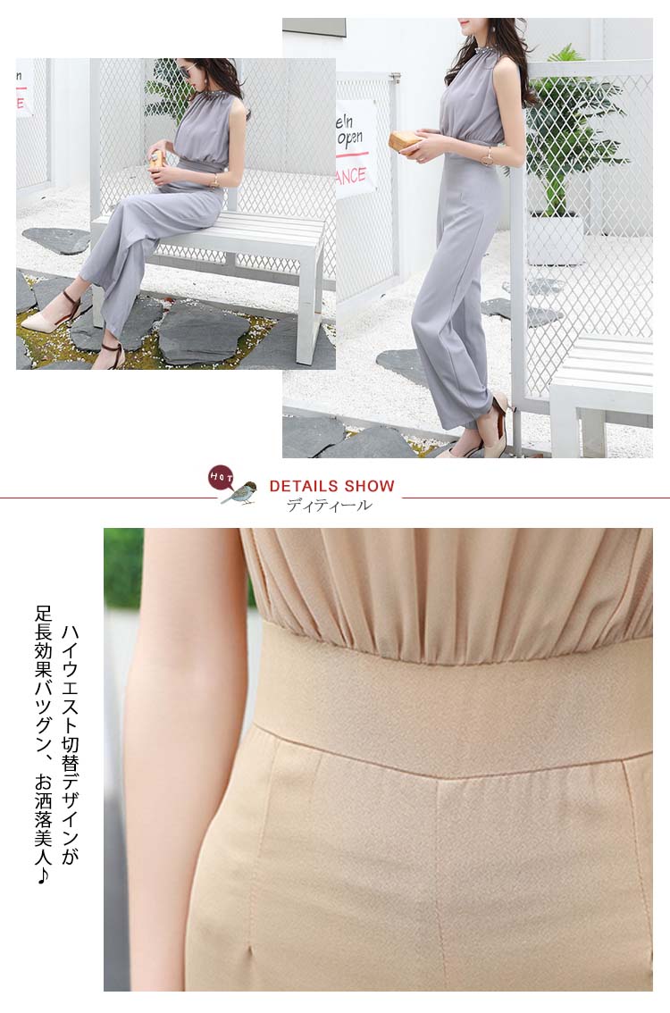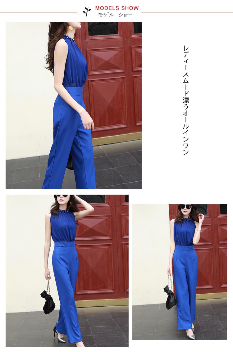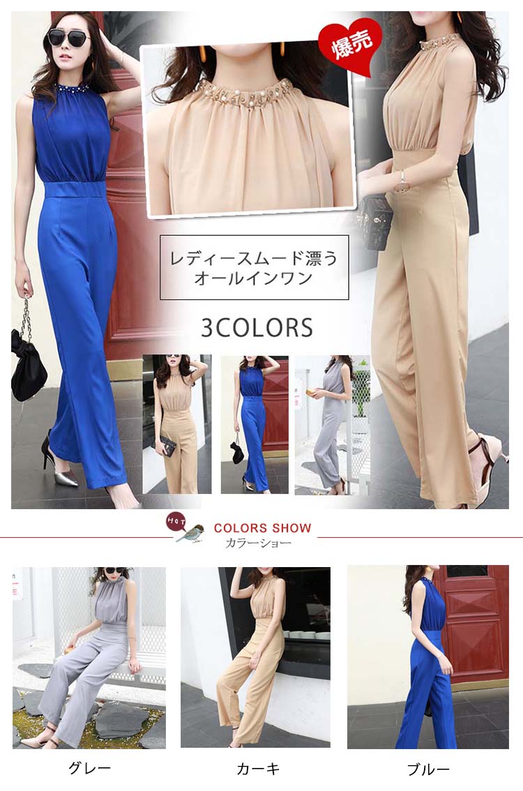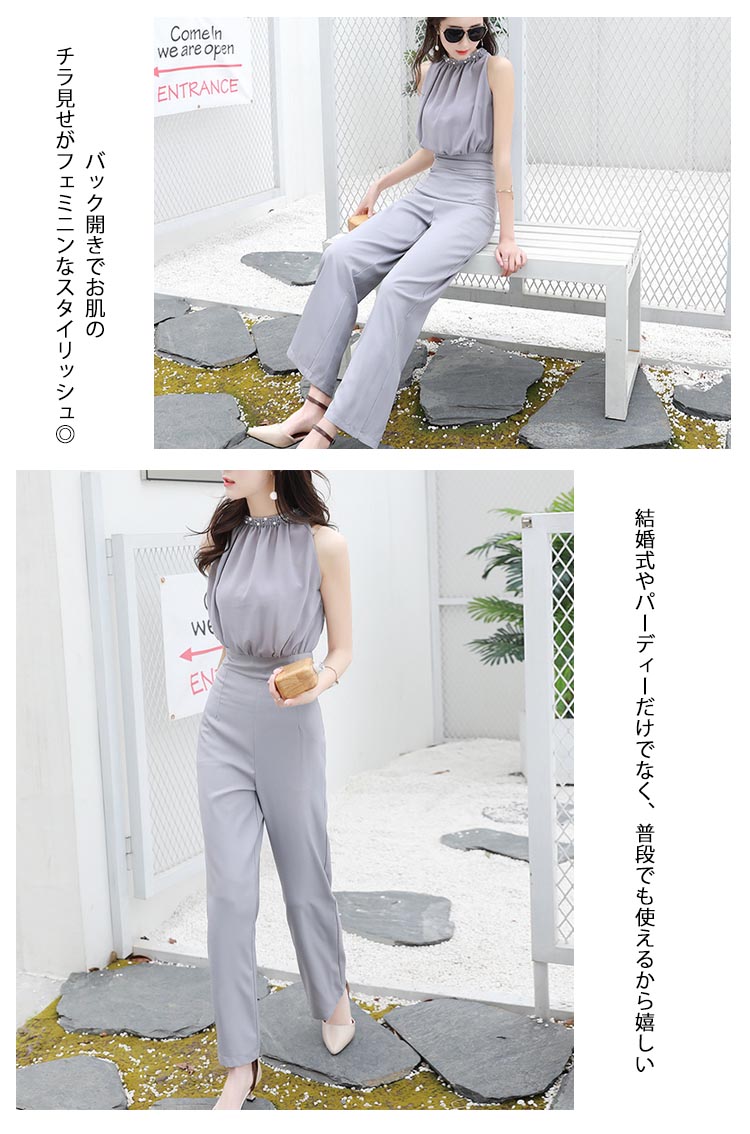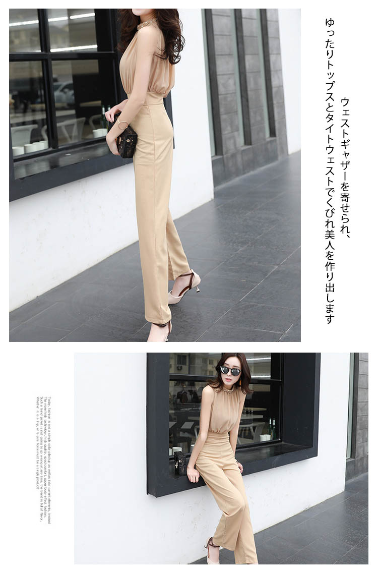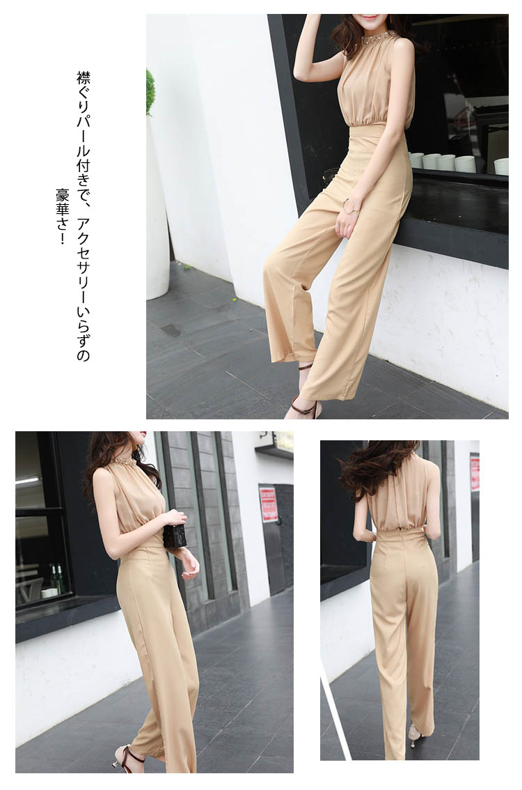 | レディースムード漂うオールインワン襟ぐりパール付きで、アクセサリーいらずの豪華さ!ウェストギャザーを寄せられ、ゆったりトップスとタイトウェストでくびれ美人を作り出しますバック開きでお肌のチラ見せがフェミニンなスタイリッシュ◎結婚式やパーディーだけでなく、普段でも使えるから嬉しい | |
