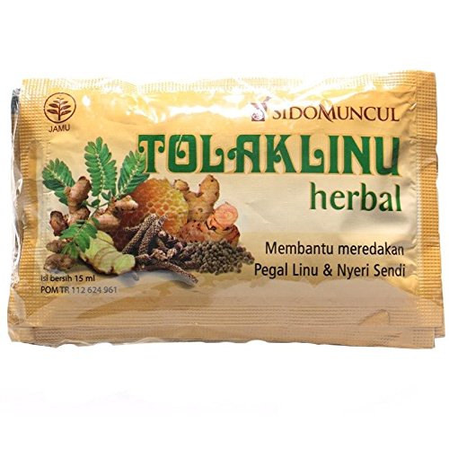 -. Binding : Health and Beauty -. Brand : Tolakangin -. EAN : 8998898335415 -. Feature : Product of Indonesia / Halal certified product / Helps relieve stiff and painful joints / 5 sachets @ 15ml each box / 1 box per order -. IsAdultProduct : 0 -. Label : Sido Muncul -. Manufacturer : Sido Muncul -. MPN : 8998898336412 -. PackageQuantity : 1 -. PartNumber : 8998898336412 -. ProductGroup : Health and Beauty -. ProductTypeName : HEALTH_PERSONAL_CARE -. Publisher : Sido Muncul -. Studio : Sido Muncul -. Title : Sido Muncul Tolak Linu Herbal 5-ct, 75 Ml/2.5 fl oz (Pack of 1)
