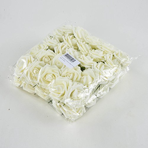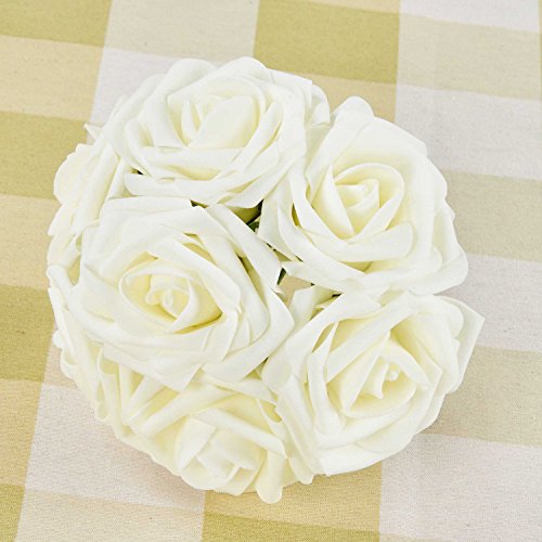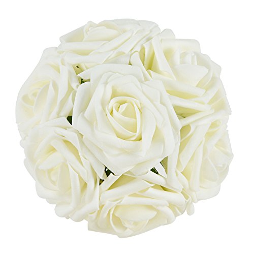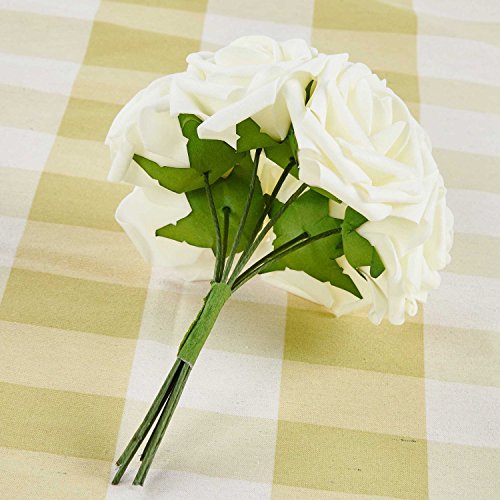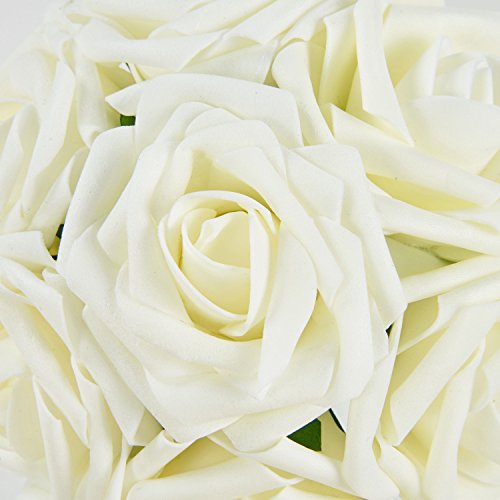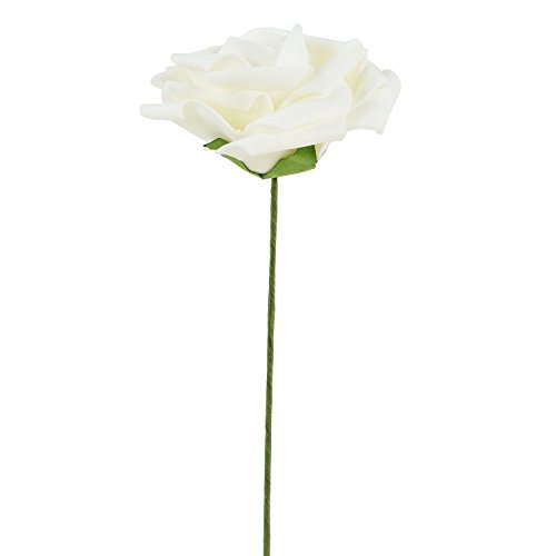 Sisjuly 50pcs PE Artificial Roses Flowers with Green Leaf Care DIY for Wedding Bride Bouquets Ivory
