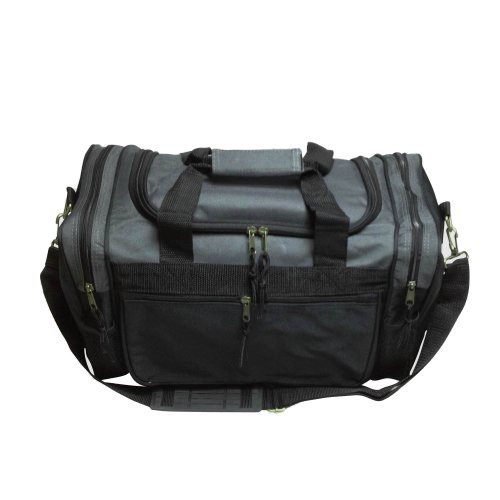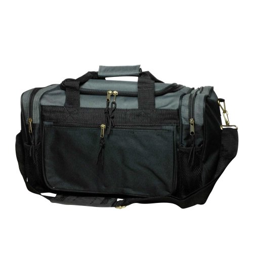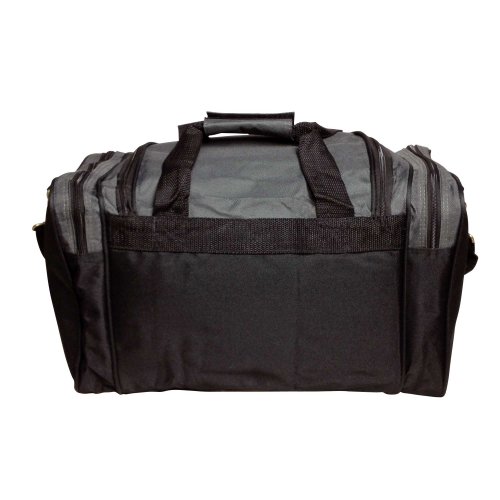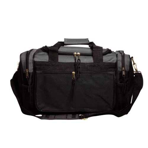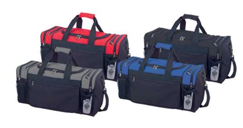 -. Feature : FEATURES: Large side zippered pocket, end zippered & 2 mesh pockets. Adjustable Strap / MATERIAL: 600D Polyester. Comes with Bottom Gusset Support Pad / SIZE: 17" X 10" X 9" / COLORS: Black, Black/Royal, Black/Red, Black/Dark Gray / INTENDED USE: Gym, Sports, Travel, Carry-on, Lage, Camping, Hiking and More!