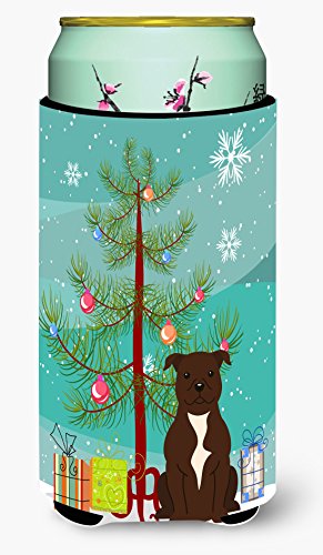 Caroline's Treasures Merry Christmas Tree Staffordshire Bull Terrier Chocolate Tall Boy Beverage Insulator Hugger BB4173TBC, Multicolor