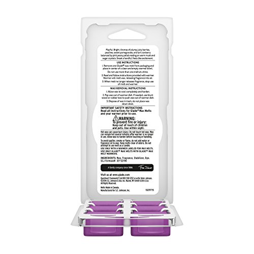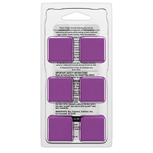 ReleaseDate : 2017-10-02 Studio : SC JOHNSON Publisher : SC JOHNSON Binding : Health and Beauty Product Description Give even your largest rooms a boost of flameless fragrance with Glade Wax Melts. Cubes of scented wax melt release true-to-life fragrance - filling your home with a scent you'll love. Glade Wax Melts are available in a wide variety of your favorite Glade scents. Playful. Bright. Notes of plump, juicy berries, peaches, sweet pomegranate, and tart cranberry balanced by pink peony petals resting on warm musk and sugar crystals. Sneak a handful. Feels like excitement. 0