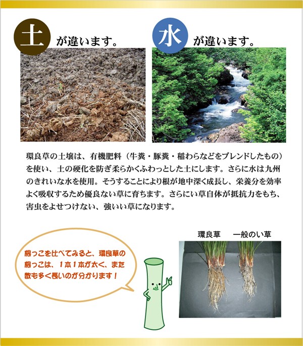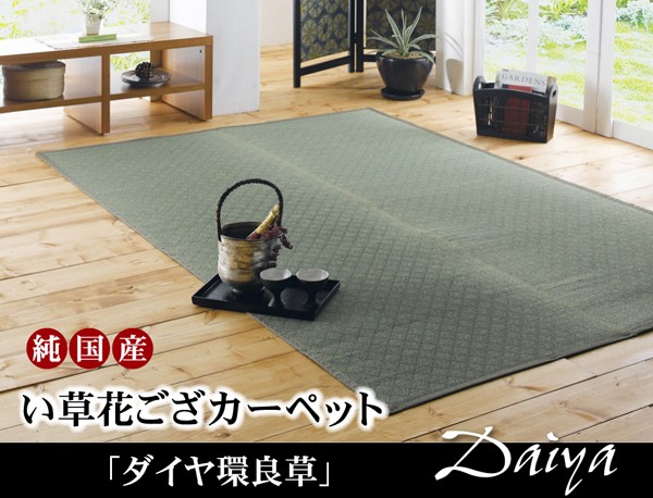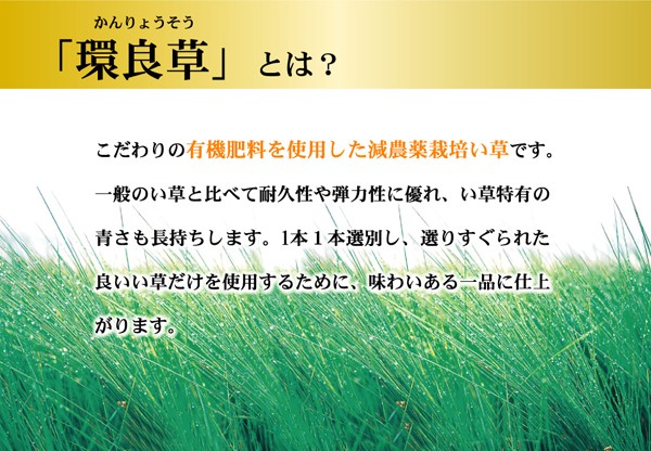 有機肥料(牛糞、豚糞、稲ワラなどをブレンドしたもの)を使った減農薬栽培の国産(九州産)のい草を使用しています。一般のい草と比べ耐久性や弾力性に優れています。一般のい草と比べて色の褐色が遅く、青さが長く残ります。月日を追うごとに飴色に変化し、より気品が増します。またい草一本一本を手作業で選別し選りすぐられた良いものだけを使用するため味わい深い花莚、すばらしい一品となります。い草には空気の自然浄化作用、湿度の調節作用などがあります。また汚れにくく、使用するうちに黄金色に変化し味が出ます。い草に青森ヒバ加工を施しています。(抗菌、防臭効果)