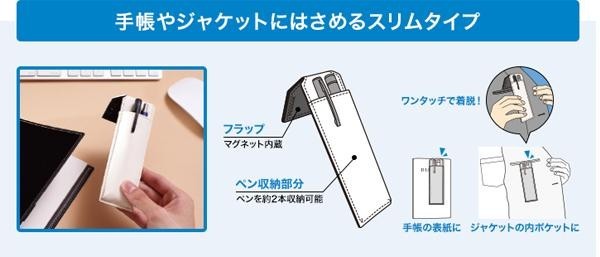 マグネットが内蔵されており、手帳やジャケットにはさめるスリムなタイプです。