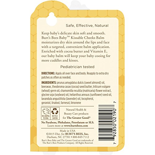 Moisturize and soften around your little one's delicate lips and face with this 100% natural baby balm. The convenient balm application helps you target the dry areas around the lips and face while at home or on the go. Made with the buttery richness of cocoa butter, vitamin E and beeswax that's gentle enough to pamper baby's delicate skin. This pediatrician-tested tube of balm contains no parabens, phthalates, petrolatum or SLS. Nurture baby's skin naturally with Baby Bee from Burt's Bees.Feature