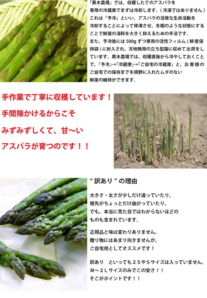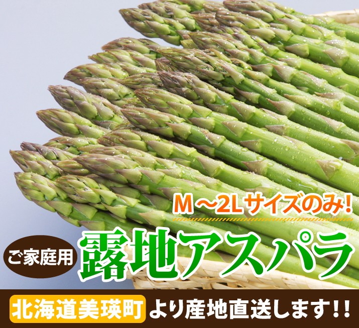 | 商品内容 | 北海道美瑛産減農薬露地栽培 ご家庭用グリーンアスパラガス 2kg(M~2Lサイズ)化粧箱入り(500g×4パック) ◎楽しい簡単レシピ付き |