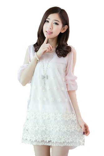 -. Title : ふんわり袖のワンピース チュニック シフォン 七分袖 五分袖 レース 花柄 ラウンドネック ピンク パステル カラー 人気 ビューティー スリム ミニスカート ドレス フォーマル 結婚式 パーティー 2次会 T-039