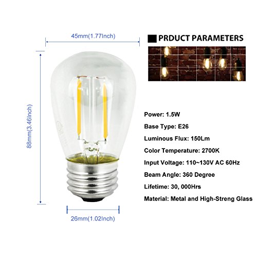 - Long Lifetime: This edison string lights replacement bulbs with 30,000 hours long lasting lighting time, no frequent bulb replacement, Eco-friendly, no mercury, no lead