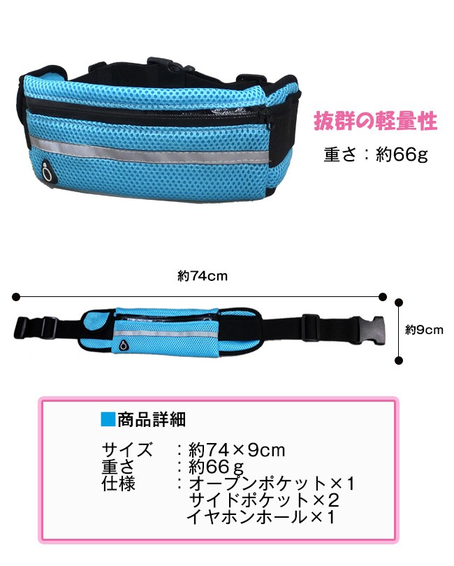 | 内容 | スポーツ用のウエストポーチで、軽量かつコンパクト。 iPhoneやスマホなどのチョットした小物を入れて頂けます。 ウエストポーチになっているため、 手がふさがらずランニングポーチとして最適です。 イヤホンホールがあり、ランニングをしながらでも、 音楽が楽しめます。 |