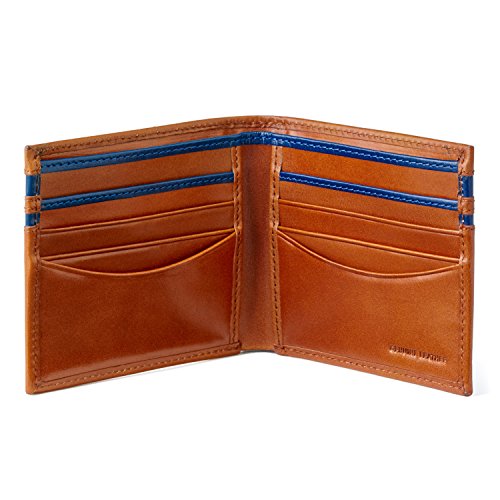 Binding : Apparel Product Description This Leather Cut Sew Tipped Billfold Wallet in Tan/ Navy is a handsome stylish wallet that is made for today's gentleman. This billfold wallet has tipping that's made from the cut-and-sew strips. The wallet has places to put your notes and cards and it's finished with the beautifully debossed laurel wreath. 0