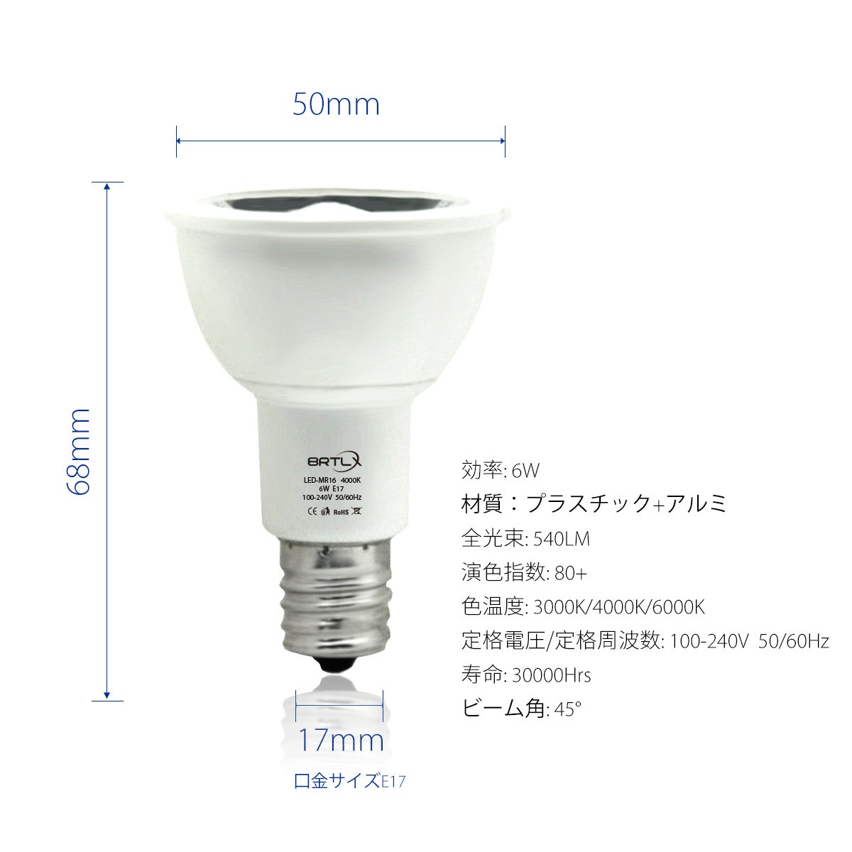 Size: E17: Diameter 50 × Total Length 68 mm