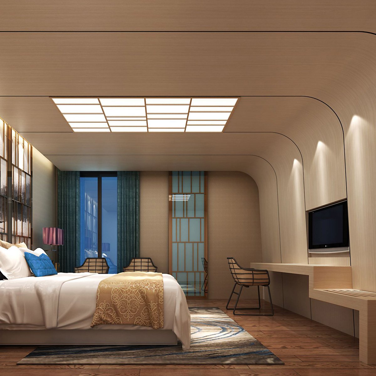 The lighting in the bedroom is made a gentle atmosphere, giving a feeling of warmth.