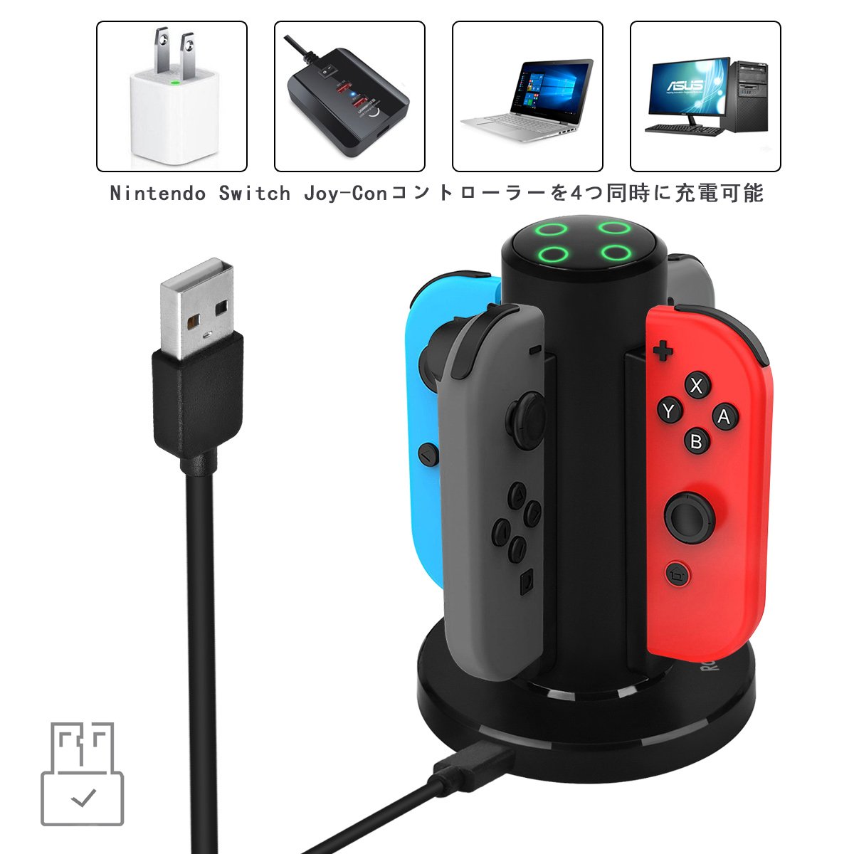 ★対応機種:Nintendo Switch Joy-Con専用の充電器になります。Joy-Conを本製品上に配置された充電用端子に差し込みと、付属の1.2MのUSB充電ケーブルでモバイルバッテリー/パソコン/家庭用のコンセントなどに接続して、Nintendo Switch Joy-Conコントローラーを4つ同時に充電可能です。