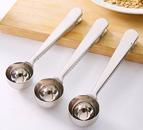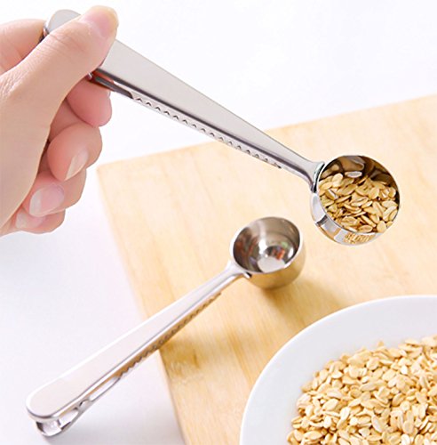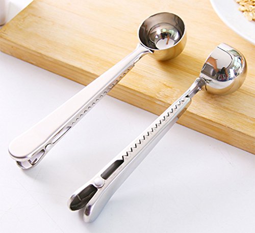 Stainless steel. 1 table spoon. With Integrated Bag Clip. Great for Measuring Coffee, Protein Powder, Spices and More - Perfect for Coffee Enthusiasts. 2 Pack.