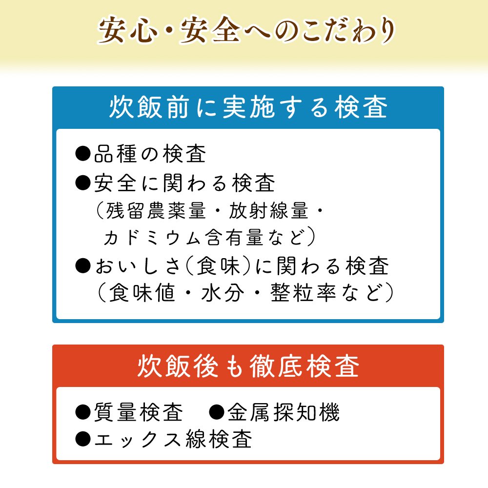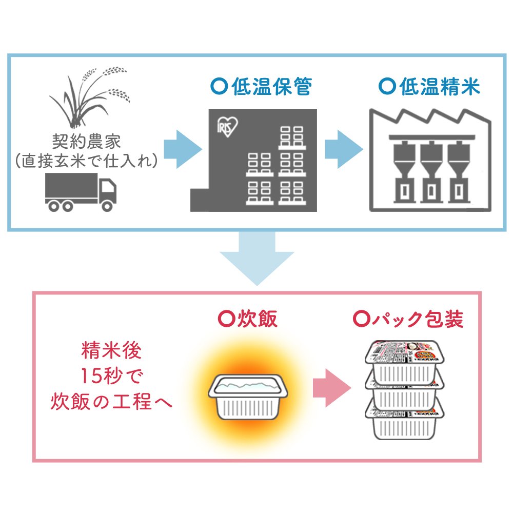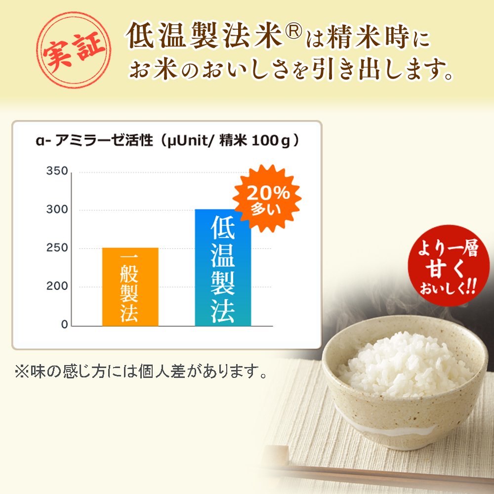 We use low-temperature manufactured rice stored and polished under low temperature control.