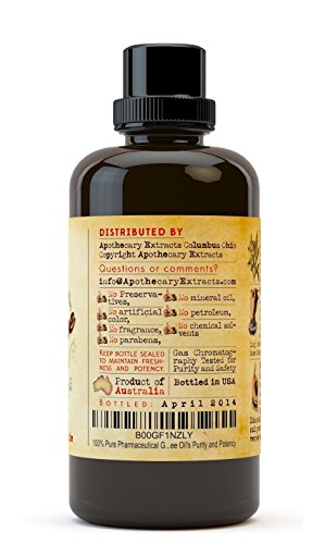 100% pure and unadulterated Tea Tree Oil. The Australian standards require that the oil of Melaleuca alternifolia must be composed of less than 15 cineole and over 30 terpinen-4-ol. You can request copies of our Gas Chromatography reports which show that Apothecary Extracts' Tea Tree Oil is not only compliant with these regulations but surpasses them. Apothecary Extracts is composed of less than 5 cineole and over 35 terpinen-4-ol which qualifies for Pharmaceutical Grade as established by the Australian Tea Tree Oil Industry Association. No fillers, additives, bases or carriers added.