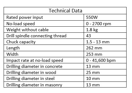 Specifications of Bosch GSB 1300 Professional Impact Drill +FREE5pcsMetalDrillBitsand Concrete Drill Bits