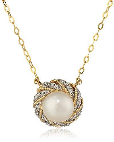 Seventeen-inch necklace in 10k yellow gold featuring cultured freshwater pearl pendant wreathed in accent diamonds