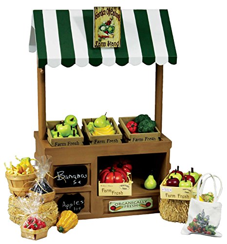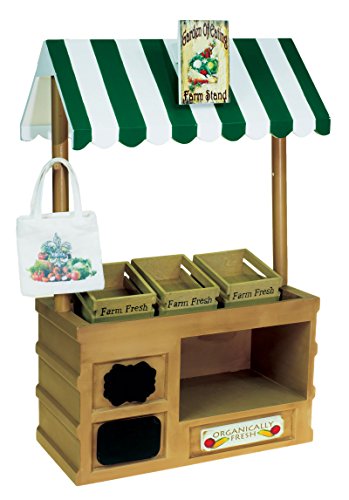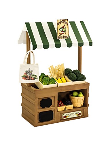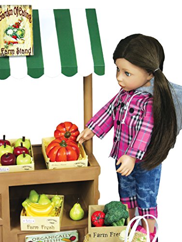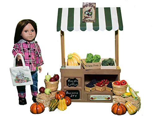 - Feature : Inspired by real roadside Farm Stands, this 18" doll accessory play set is designed to encourage the growth of imagination and entrepreneurial spirit! / Framed counter (13"W x 6.75"D x 7.5" H) features a roof awning with a "Garden of Eating" farm stand sign, a peg to hang totes, a self-serve cubby in front and a handy storage nook in back. Sized for 18" doll play. / Set also includes 1 Organically Fresh sign, 2 "blackboard" signs, chalk, canvas shopping tote, 3 Farm Fresh crates plus a movable "riser" for making tempting produce displays. Farm Stand sign can be swapped with other Shoppe "themes" to create a variety of 18" doll Shoppes! *Veggies and Fruit sold separately* / Sturdy wooden pieces are crafted for years of interactive play with 18" dolls and 18" doll accessories. Simple assembly. Stand measures 13"L x 6.75"W x 20.5"H overall. / Designed and manufactured by The Queen's Treasures® , offering the highest quality 18" Doll Furniture, 18" Doll Clothes, 18" Doll Shoes & 18" Doll Accessories!