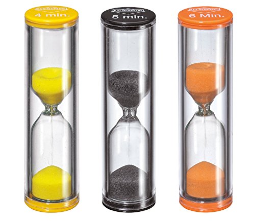 -. Binding : Kitchen -. Brand : Kuchenprofi -. Color : Assorted -. EAN : 4007371058315 -. Feature : Set of three color coded sand egg timer set / Yellow is a 4 minute timer, blue is a 5 minute timer and orange is a 6 minute timer / Simply turn over to set the time / Made of glass with coordinated plastic and colored sand / Wipe clean with damp cloth -. Label : Kuchenprofi -. Manufacturer : Kuchenprofi -. Model : 10.0928.00.00 -. MPN : 1009280000 -. PackageQuantity : 1 -. PartNumber : 1009280000 -. ProductGroup : Kitchen -. ProductTypeName : KITCHEN -. Publisher : Kuchenprofi -. Studio : Kuchenprofi -. Title : Kuchenprofi Sand Egg Timer Set, Set of 3