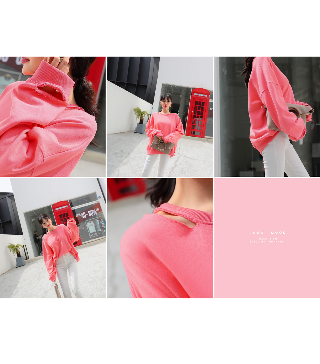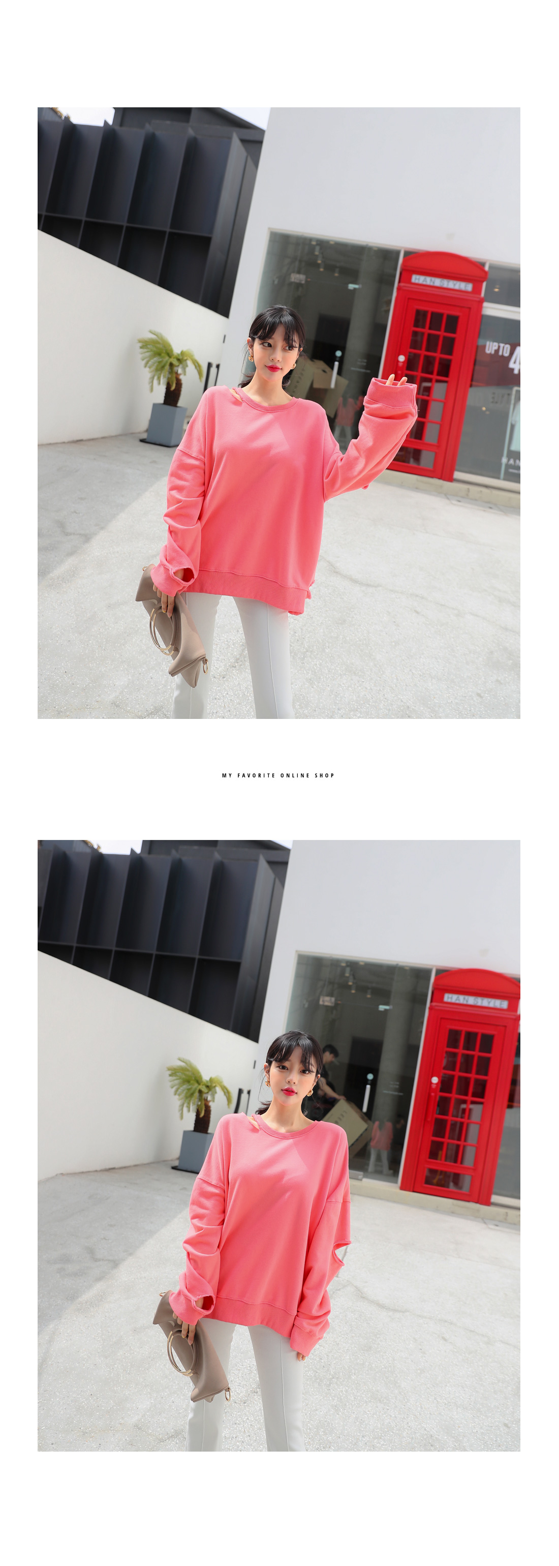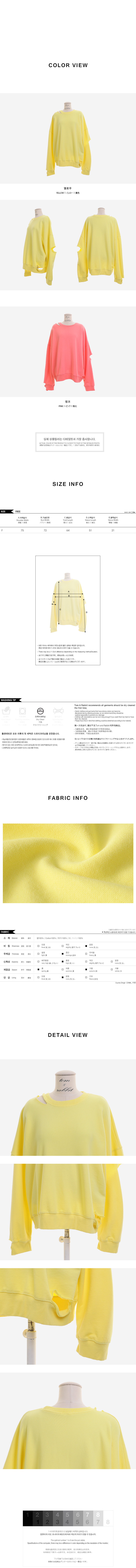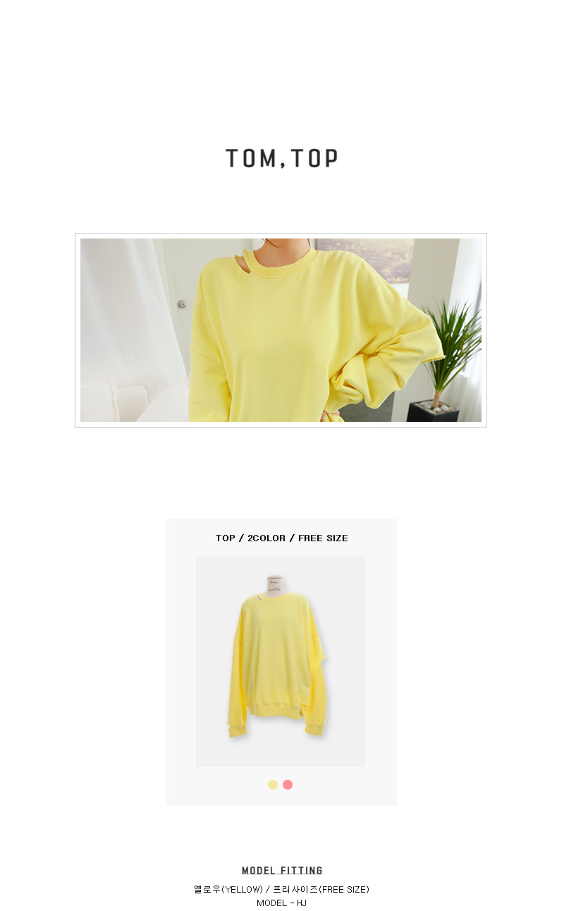 루즈한 핏이 매력적인 컷팅 맨투맨을 소개합니다.루즈한 핏에 드롭 소매 디자인으로 여리여리하게 연출하기 좋으며컷팅 디테일이 포인트로 들어가빈티지한 무드를 더한 맨투맨 아이템이랍니다.신축성 좋은 소재로 편안한 착용감을 자랑하며상큼한 컬러들로 구성되어 포인트로 입기 좋아요.스커트와 함께 매치하여 걸리쉬한 무드로 연출하거나팬츠와 함께 캐주얼하고 내추럴한 무드로 스타일링해도예쁘게 잘 어울려 활용도가 높답니다.여유있는 핏으로 편하고 가볍게 입기 좋으며컬러는 옐로우, 핑크 2 가지로 구성되었어요.