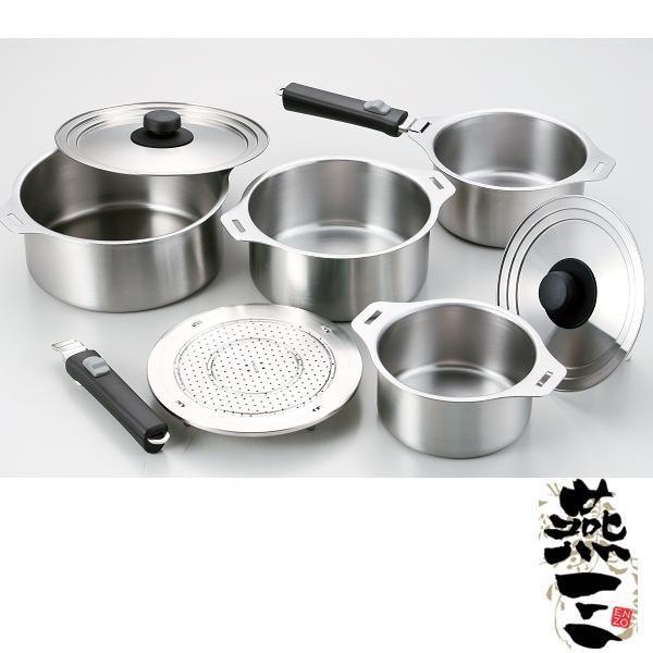 | セット内容 | 鍋14cm(約1.1L) 鍋16cm(約1.6L) 鍋18cm(約2.1L) 鍋20cm(約2.8L) 兼用蓋(14、16cm用) 兼用蓋(18、20cm用) 蒸し台 着脱ハンドル各1 |