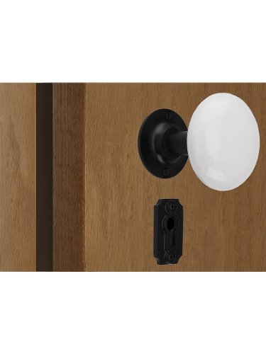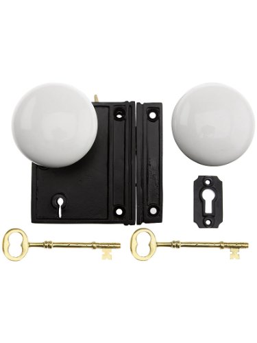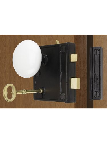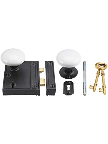 -. Title : Cast Iron Vertical Rim Lock Set With White Porcelain Door Knobs. Reproduction Iron Rim Lock.