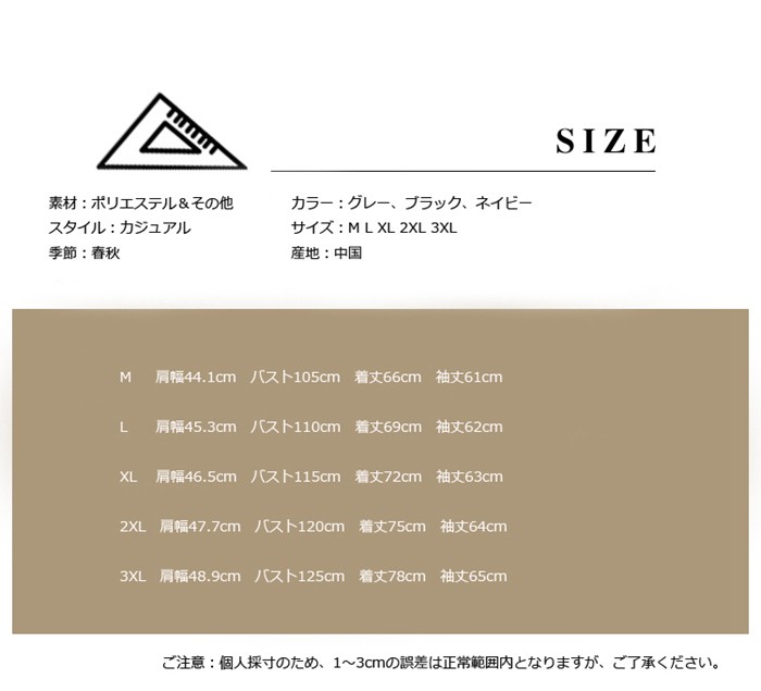 マウンテンパーカー メンズ ジャケット メンズ ショート丈 無地 大きいサイズ ゆったり 春コート トップス 撥水 アウトドア 2018新作登場 マウンテンパーカー メンズ 大きいサイズ 春コート トップス商品詳細素材:ポリエステル&その他スタイル:カジュアル季節:春秋カラー:グレー、ブラック、ネイビーサイズ:M L XL 2XL 3XL産地:中国サイズ参照表M 肩幅44.1cm バスト105cm 着丈66cm 袖丈61cmL 肩幅45.3cm バスト110cm 着丈69cm 袖丈62cmXL 肩幅46.5cm バスト115cm 着丈72cm 袖丈63cm2XL 肩幅47.7cm バスト120cm 着丈75cm 袖丈64cm 3XL 肩幅48.9cm バスト125cm 着丈78cm 袖丈65cmご注意:個人採寸のため、1~3cmの誤差は正常範囲内となりますが、ご了承ください。マウンテンパーカー メンズ ジャケット メンズ ショート丈 無地 大きいサイズ ゆったり 春コート トップス 撥水 アウトドア 2018新作登場 マウンテンパーカー メンズ 大きいサイズ 春コート トップス