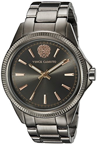 Coin edge bezel with mineral crystal lens; gunmetal sunray dial with rose gold-tone markers and luminous hands; printed outer minute track