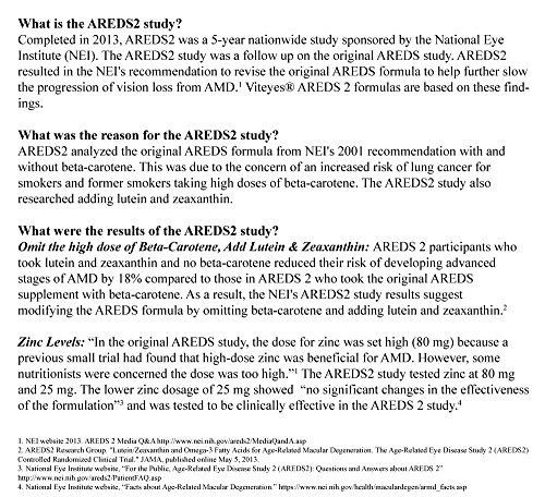 -. Binding : Health and Beauty -. Brand : Viteyes -. EAN : 0882966001549 -. Feature : Based on the findings of the National Eye Institutes 2013 AREDS 2 study in 2 daily capsules / Beta-carotene free appropriate for smokers, former smokers, and non-smokers / Recommended by physicians worldwide / Manufactured in the USA / Three month supply -. IsAdultProduct : 0 -. Label : Vitamin Health Inc. -. Manufacturer : Vitamin Health Inc. -. MPN : 0154 -. NumberOfItems : 1 -. PackageQuantity : 1 -. PartNumber : 0154 -. ProductGroup : Health and Beauty -. ProductTypeName : HEALTH_PERSONAL_CARE -. PublicationDate : 2015-03-28 -. Publisher : Vitamin Health Inc. -. ReleaseDate : 2015-04-17 -. Studio : Vitamin Health Inc. -. Title : Viteyes Areds 2 Formula, 180 Count -. UPC : 798813065520