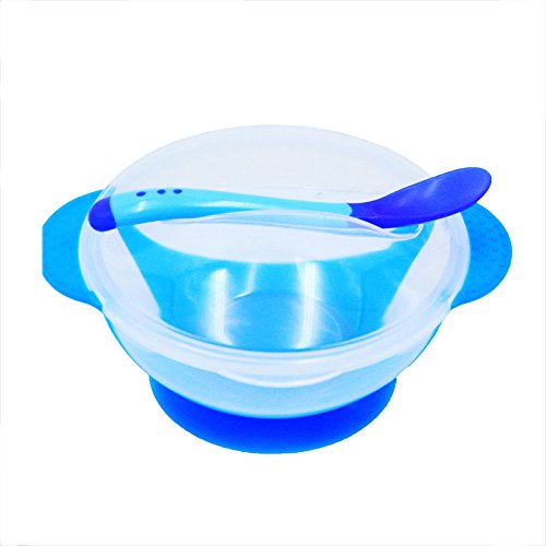 -. Feature : ボウルの底面は吸盤が付き、テーブルにしっかりしがみついて、ひっくり返されにくいです。 / 色:ブルー、イエロー、ピンク / 素材:透明度高いPP+シリコーン  使用前には本製品を清潔にし、蒸気或いはお湯で3-5分間消毒してください! / 赤ちゃんのおくちの大きさに合わせた形状でこぼしにくい構造。丸くて柔らかい素材です。 / カトラリーの先端は温度センサーの機能が付き、お湯の温度が40度以上過ぎると、先端の色は薄くなります。親はそれを基づいて子供の食事によるやけどを防ぐことができます。