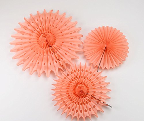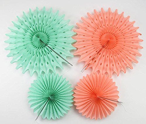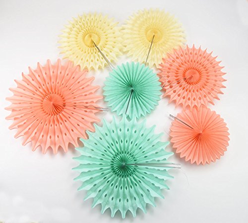 Mint Cream Peach Tissue paper fan set pack list: 2 pcs 16 inch cut out tissue paper fans in diameter(1 pcs mint green + 1 pcs peach);3 pcs 12 inch in diamater cut out tissue paper fans(2 pcs cream+1 pcs peach);2 pcs 10 inch in diameter tissue paper fans;(1*mint green+1 pcs peach);Totally 7 pcs.