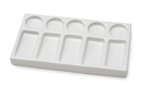 Pure white 10-well porcelain palette makes mixing paint a breeze. Quality porcelain paint palette designed to be a welcome addition to any artist's studio. Slick glaze is easy to clean and prevents your paint from absorbing into the surface. Take a break from flimsy plastic. Oblong shape, with 4 small wells and 4 larger for great mixing capability.Feature