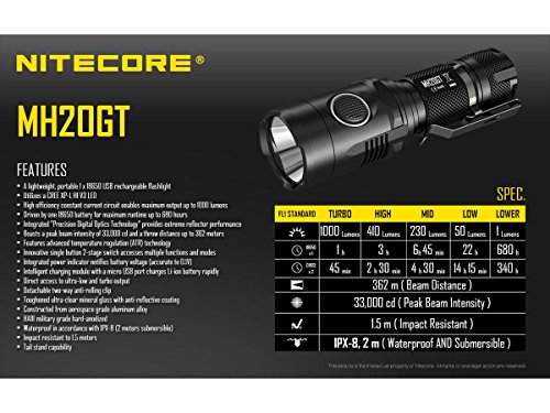 Nitecore MH20GT Rechargeable Flashlight -1000Lm w/ NL189 Battery, USB Adaptors, 2 Premium CR123A Batteries +FREE Andrew & Amanda Pen