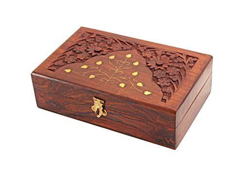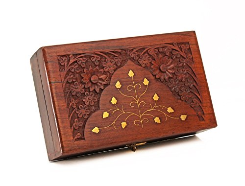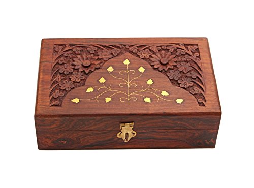 Diwali Gifts Wooden Keepsake Storage Box Jewelry Trinket Holder Organizer Floral Hand Carvings with Brass Inlay