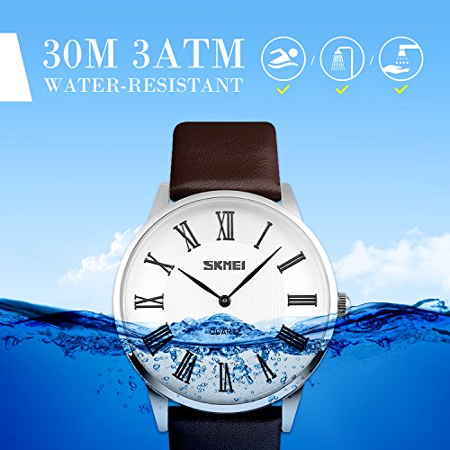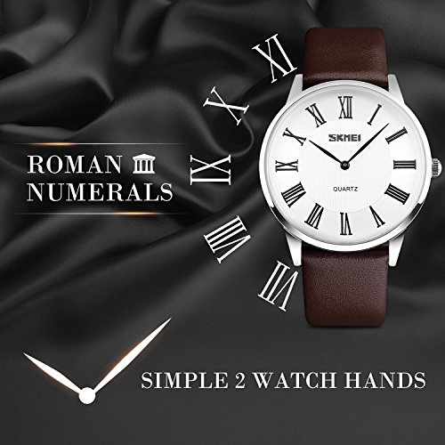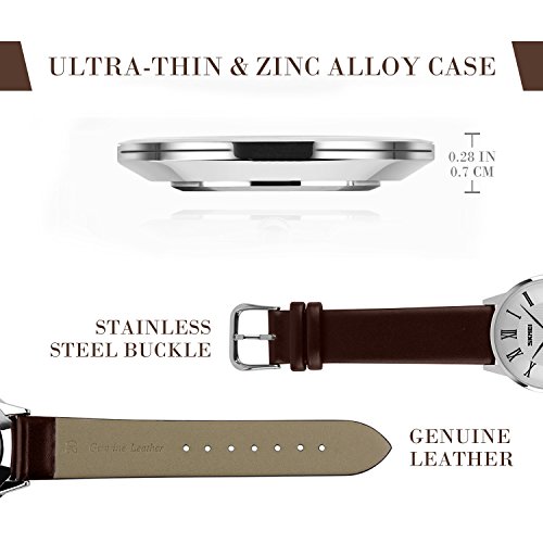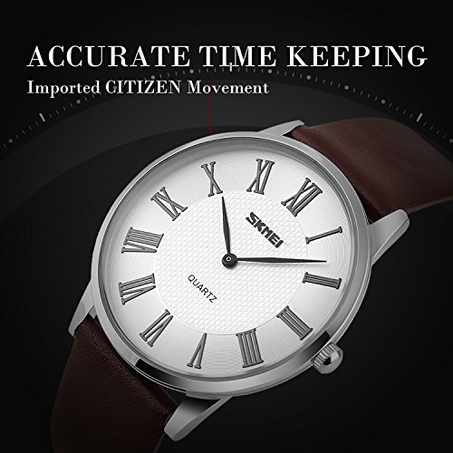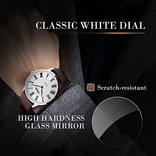 -. Feature : PRECISE TIME KEEPING, EASY TO READ. High Quality Imported Quartz Movement provides precise and accurate time keeping. Time is super easy to read with high quality mineral glass watch face and clear Roman Numerals time marks. / WATERPROOF FOR DAILY USE: 98 FT waterproof (30 M) - 3ATM. Perfect for all kind of business, casual, indoor activities and daily use. Hand wash, rain day, sweating, no problem! NOTE: Please DO NOT pull out the button under the water. Too much water contact or usage in extreme Hot or Cold temperature will damage the leather band and shorten watch life. / CLASSIC BUSINESS AND CASUAL DESIGN, AN IDAEL COMPANION FOR MEN. Luxury and gentlemanlike leather band brings you classic and business simplicity fashion. Ultra-thin case, easy to read time marks and unique design of silver color metal scale go into every detail of the watch, which makes you the focus of attention in all occasions. / COMFORTABLE AND DURABLE LEATHER BAND STRAP and STAINLESS STEEL CASE COVER. NOT EASY TO FADE. Durable high quality leather watch band strap. Stainless steel water proof case cover make it super durable. Comfortable and high quality watch band with the minimalism design make it comfortable to wear and lead you to the edge of sport fashion. Perfect for both indoor and outdoor activities. / KEY SCRATCH RESISTANT, ADJUSTABLE BUCKLE, SPECIAL 2 WATCH HANDS DESIGN. Simple and easy to wear, no worry about the complicated operations. You can adjust it according to your wrist. Just enjoy every minute with it! Pick one, you deserve it! What Is In The Package: Men's Quartz Watch x 1
