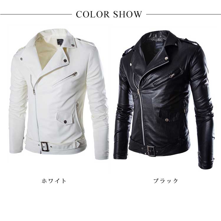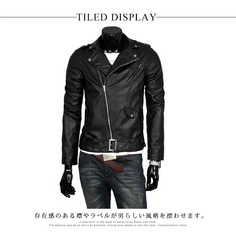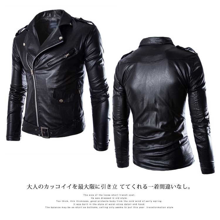 | 気軽に着れるレザーライダースジャケット。存在感のある襟やラペルが男らしい風格を漂わせます。上品なPUレザーを使用して、絶妙な微光沢が出ます。ハードなイメージを程度よく中和してくれながらも、サイズ感はスリムに仕上げることにより着た時のスタイリッシュな印象をキープ。大人のカッコイイを最大限に引き立 ててくれる一着間違いなし。 | |