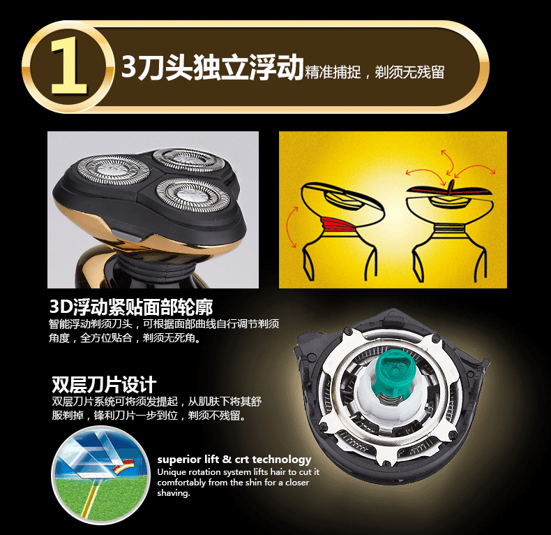 Pivoting triple-head 3D design,automatically adjusts to every curve on your face for