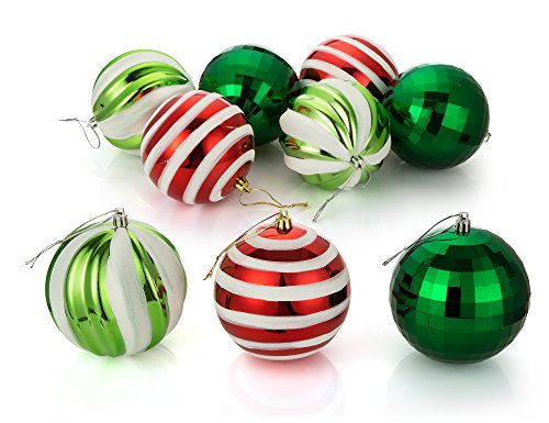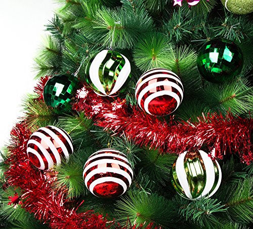 The traditional color combinations feature Red and white glitter stripes balls, apple green with white glitter strap balls, forest Green shiny disco balls. Add some sparkle to your holiday decor this year with this glitter embellished, round shaped Christmas ornaments