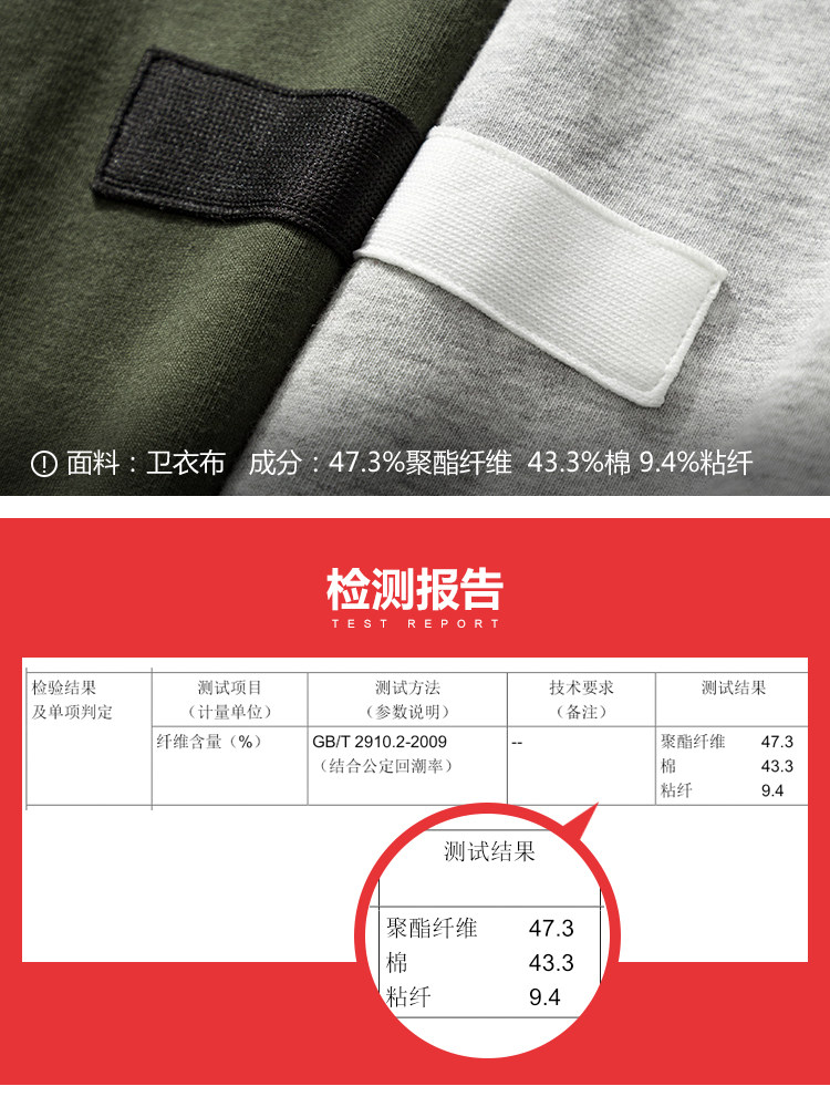 | 面 料:47.3%聚酯纤维 43.3%棉 9.4%粘纤颜 色:军绿、灰色 |