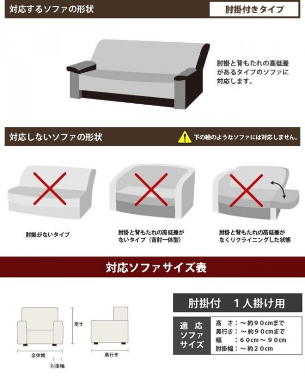 | 仕様 | 抗菌防臭加工(SEKマーク取得) ウォッシャブル(洗濯機洗い可能・ネット使用) 【適応ソファーサイズ】 高さ:~約90cmまで 奥行き:~約90cmまで 幅:60~90cm 肘掛幅:~約20cm |