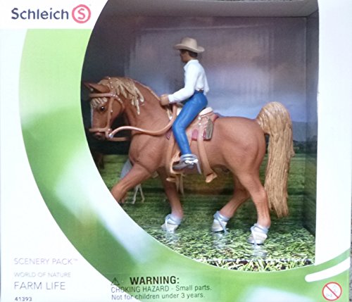 -. Feature : Schleich Figure Set / Farm Life Scenery Pack / Cowboy, Horse, Saddle, & Bridle included / Measures 5" X 5"