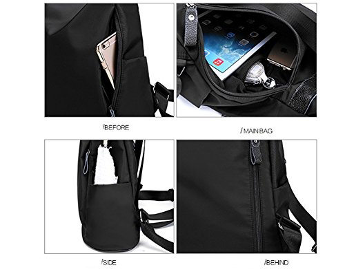The main pocket provides divider pockets for cell phone, cards, and wallet / Closure type: zipper, the zipper of main pocket is in back to guard against theft / Capacity: It is available for iPad, mobile phone, napkin, notebook, cards, umbrella, water bottles, cosmetics / Fabric Oxford 90%, 10% leather that can resist a little water / Backpacks dimension:12.2"*5.5"*12.2" (Length*Thickness*Height)