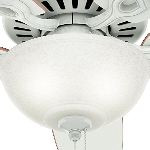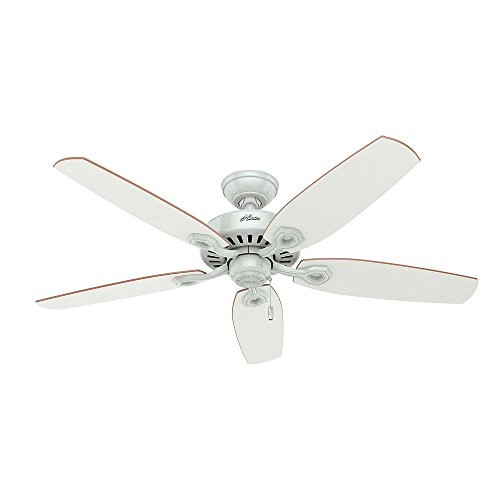 When you've arrived at that place where you're simply unwilling to settle for anything less than the very best, you're ready for Hunter's Builder Deluxe. Builder Deluxe ceiling fans are more than just beautiful-they're painstakingly designed and carefully crafted. This is a fan you can count on for unmatched performance, a great price and easy installation. Uncluttered style in a white designer finish blends seamlessly with your decor. Reversible White/Beech blades let you customize your blade finish to furniture or wood molding. The simple light fixture features a snowflake linen glass bowl and uses two 60W candelabra bulbs (included). High performance, Whisper Wind Motor delivers ultra-powerful air movement with whisper-quiet performance so you get the cooling power you want, without the noise you don't.Feature