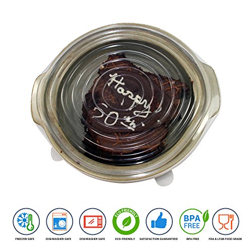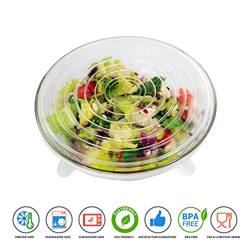 SET OF 6 UNIVERSAL SILICONE STRETCH LIDS WITH AIRTIGHT FIT - CLEAR - DISHWASHER, MICROWAVE, FREEZER SAFE - ASSORTED PACK OF REUSABLE FRESH FOOD COVERS - STRETCH TO FIT CONTAINERS CUPS MUGS CANS BOWLS