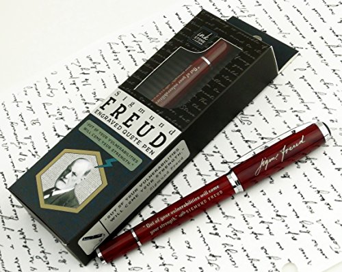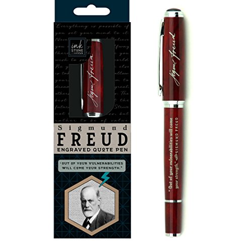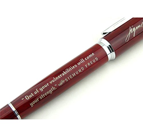 -. Feature : Sigmund Freud engraved quote pen, engraved with his famous inspirational quote, "OUT OF YOUR VULNERABILITIES WILL COME YOUR STRENGTH." / Pen cap is engraved with Sigmund Freud's signature / Elegant metal pen with lacquered wood-colored finish; Weight of pen: approximately 35g; Size of pen: approximately 5.5" long / Roller ball writing tip with black ink; Easy-to-replace ink cartridge / A suitable gift for psychologists, therapists, counselors, psychology students, and more!