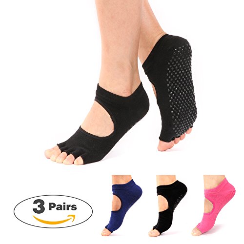 -. Feature : Material: 80% combed cotton, 16.6% Polyester, 3.4% nylon, it's a eco friendly yoga sock, made of breathable cotton, keeps your feet dry and healthy / Five toes separator socks, keep each toe separated, prevent bacterial growth, perfect for yoga, pilates, ballet, aerobics, barre or other dance / Toeless yoga socks, exposed toes can feel from the floor, for better tactile feel and balance / The silicone gel grips on the bottom provide a non-slip surface, protect you from slipping when doing yoga or pilates / One size fits most, Small/Medium (US 4.5-10); Multi pack
